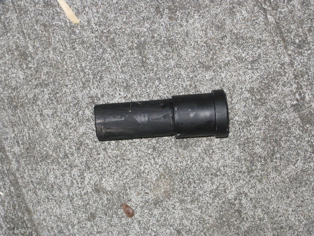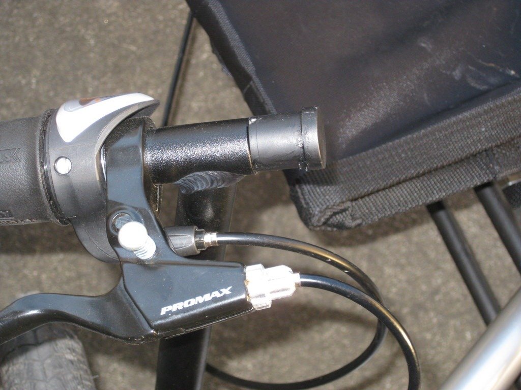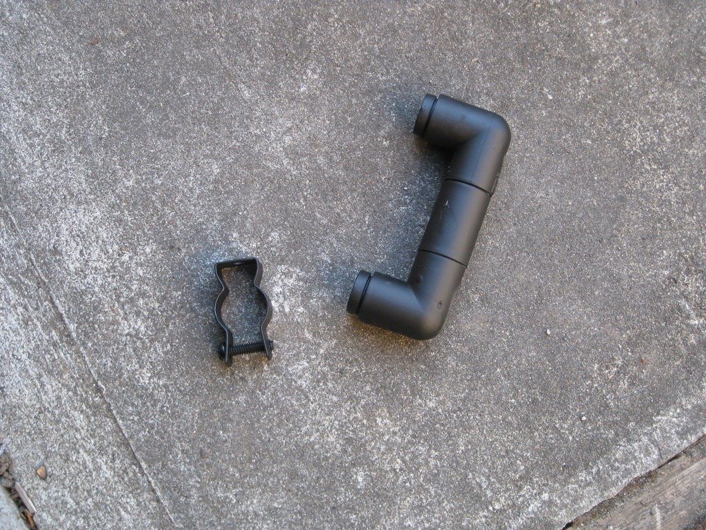 New handle bar mount. This is nothing more that a male PVC 1/2 inch plug. Took a 5/8 inch dowel, removed some wood from one end to let the plug fit snuggly on it, then painter it black and stuck it into the hollow area of the handlebar.