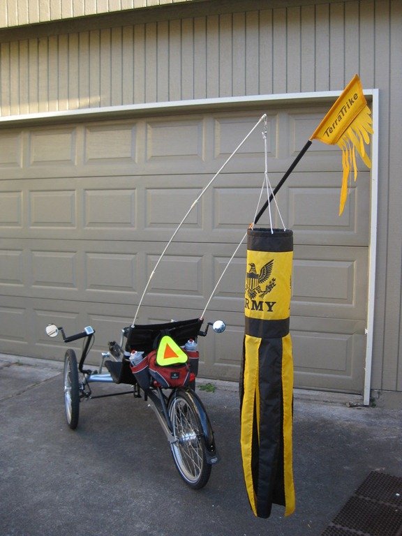 I added some stuff to the trike this week. I have been trying to figure out a way to mount the flashing white light in front. Didn’t like the dowel in the handle bar method. So first off, my Army wind sock.