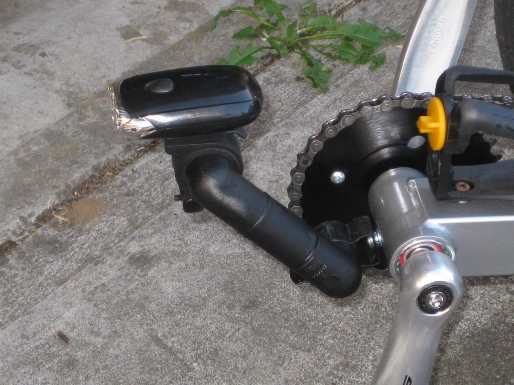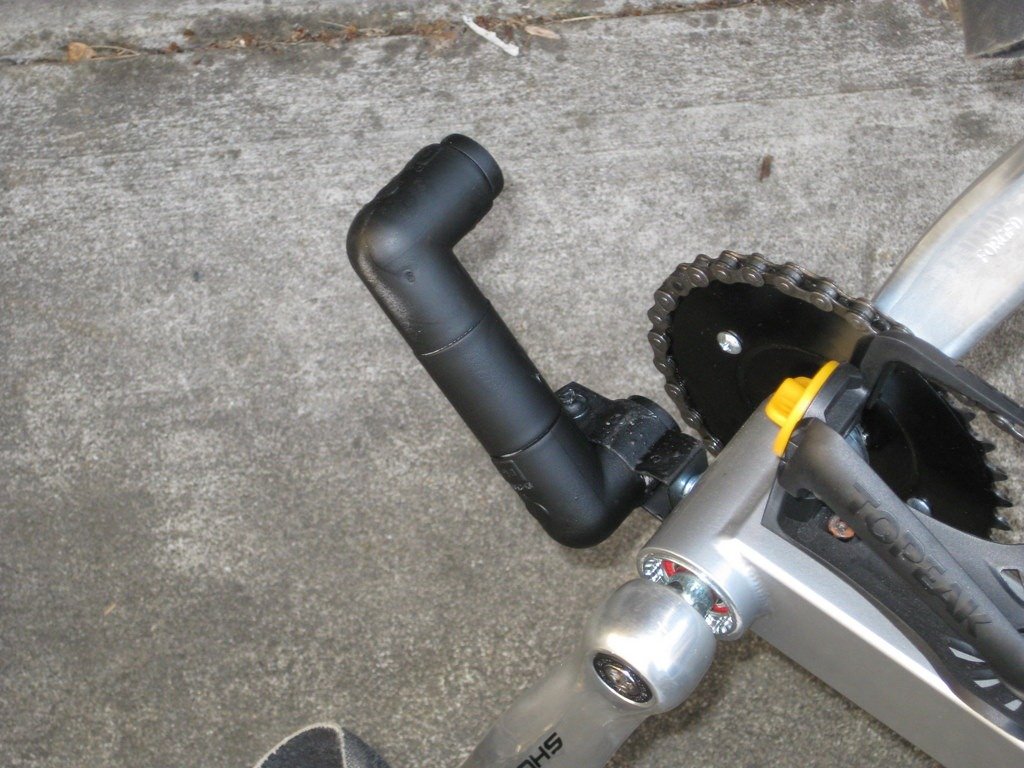 Then I started on a front light mount. I mount this into the hole used for the front reflector. I wanted to get the light out to the end of my foot to prevent the strobe effect bouncing off my feet. The hanger is a 1/2 inch conduit bracket, then 1/2 inch pvc pipe fillings for the rest. Works OK, but I have a few plans to improve it.
